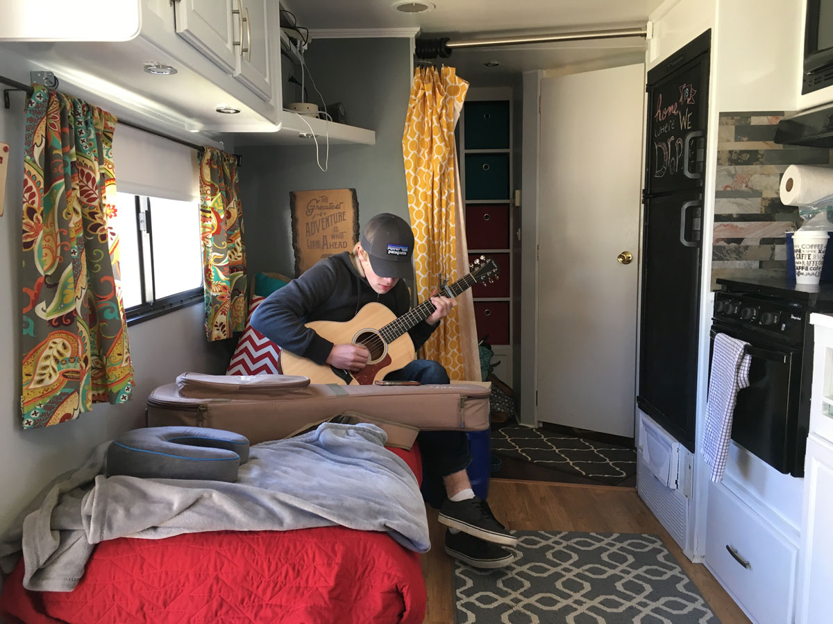 We’re doing what we love: camping in our little white box. Here’s a typical scene for us.